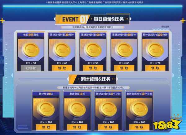 活动1:每日登录&任务,活动期间内完成每日登录和时长任务可获得活动积分,累计登录天数及时长任务,还可获得更多积分,大家请注意,每天最多累计2小时,合理作息,健康游戏!