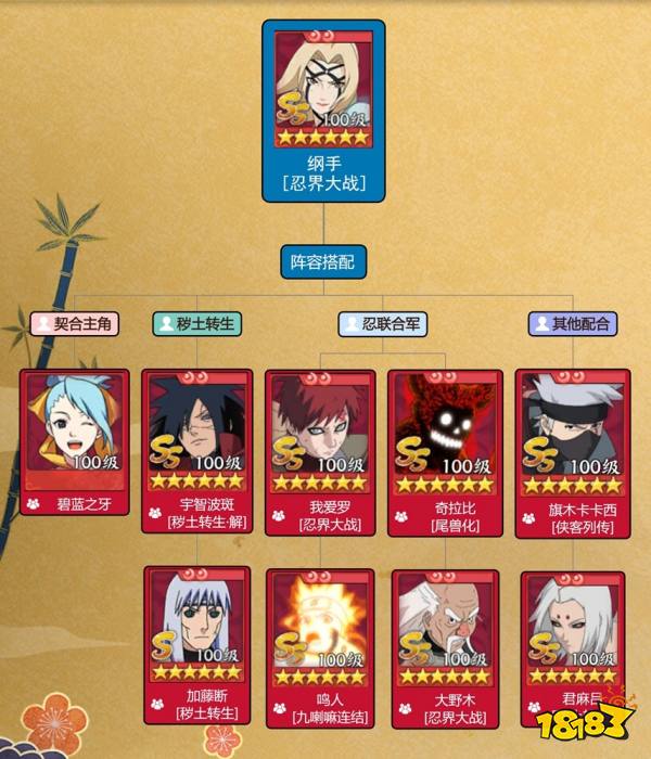 1、结合纲手[忍界大战]的技能特点,一图流搭配推荐:
