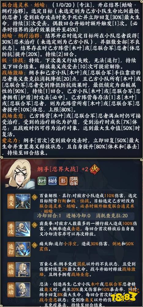 Tip:纲手的核心辅助技能,木叶和忍联合军标签忍者的奥义伤害、暴击养成,同时兼顾了自身的续航效果,同时自身还会获得伤害减免和免疫暴击的效果。