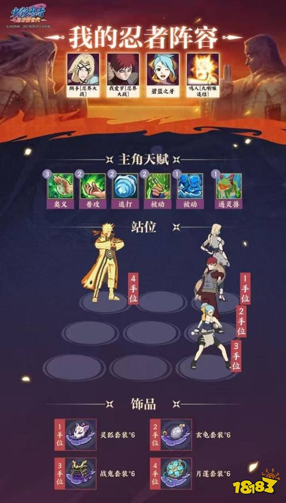Tip:纲手自身的生存技能,若配合荆棘、月莲、赤晶等饰品,生命恢复能力更强,且其余两个技能效果都能为小队木叶或忍联合军标签忍者提供不俗的辅助。