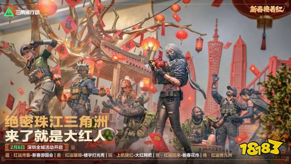 2月6日,绝密珠江三角洲活动开启,各位干员可前往深圳新春游园会逛红运市集、看红运璀璨灯光秀、玩大红网吧、赏红运花来花市。另外还有红运传九州活动,在全国“九个洲”的城市中将有惊喜内容登陆,各位干员可关注三角洲的各大官方账号,接收具体的信息与日程。