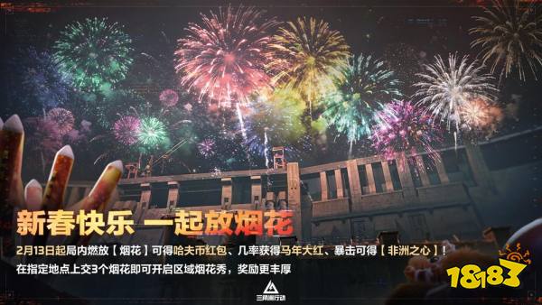 2月13日起,全新烟花玩法开启。干员在局内燃放「烟花」后,有概率获得哈夫币红包、马年大红、暴击更有机会获得「非洲之心」!在指定地点上交3个「烟花」开启烟花秀,将获得更为丰厚的奖励!