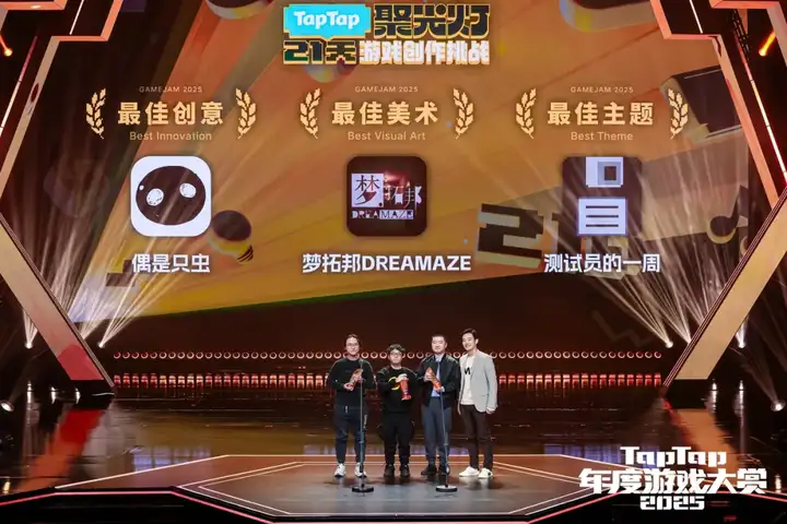 在近期举办的TapTap年度游戏大赏上,有一个环节格外动人——TapTap聚光灯21天游戏创作挑战专属颁奖。当《错误类型:Type Error》的制作人晏金晨,代表由5名学生临时组成的团队,从心动CEO Dash手中接过最佳游戏与最佳学生作品两座奖杯时,上海上音歌剧院的聚光灯不仅照亮了他们青涩却坚定的笑容,更照亮了一群草根创作者的逐梦之路。