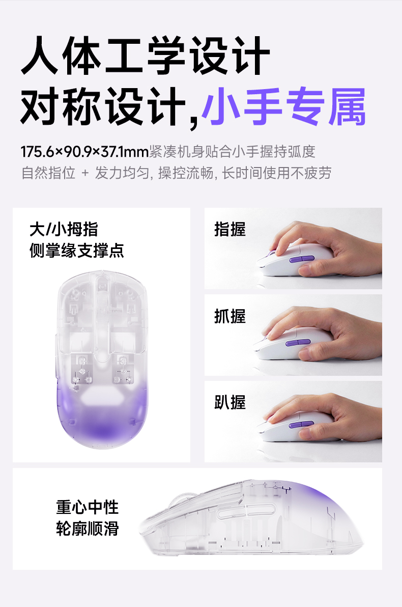 采用对称式人体工学设计,精心优化的曲线能紧密贴合中小手型玩家的掌部,提供饱满且舒适的握持感受,长时间游戏或办公也不易疲劳,被誉为“小手万金油”,兼顾灵活与稳定。