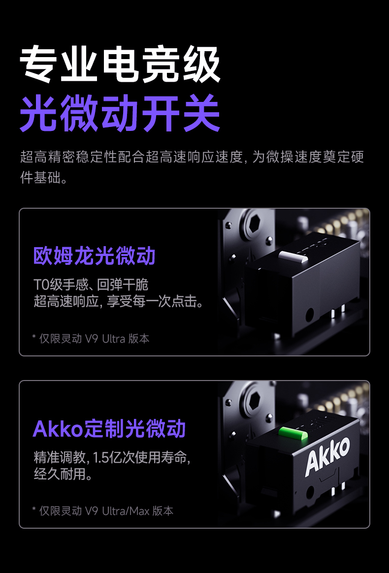 微动体验:灵动V9 Ultra 甄选欧姆龙光微动(另有Akko定制光微动版本可供选择),提供T0级清脆手感与超高速响应,每一次点击都回弹干脆,确认感十足,带来可靠的触发体验。