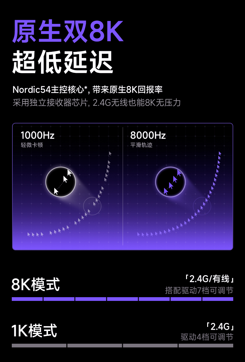 双8K回报率:灵动V9 Ultra依托Nordic 54L15强大核心,支持原生8K回报率。配合独立接收器芯片,即使在2.4G无线连接下也能稳定实现8K超高回报率,将无线延迟降至无感,画面更连贯,操作更跟手。