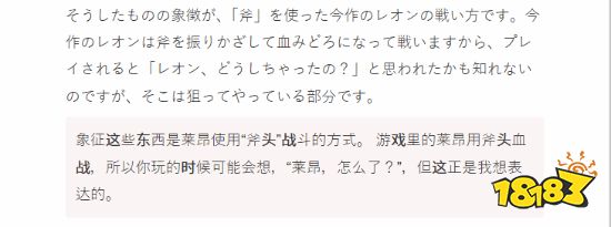 为了通过游戏玩法直观体现主角的内在变化,开发团队做出了一个关键决定:将里昂的标志性武器从以往常用的枪械,更换为斧头。中西总监指出,斧头是里昂人物转变的强烈象征。按照设计构想,里昂挥舞沾血斧头的战斗方式应能引发玩家的不安,使其感受到角色前所未有的冷酷无情,甚至让玩家产生里昂,你还好吗的疑问,而这正是开发团队意图达成的叙事效果。