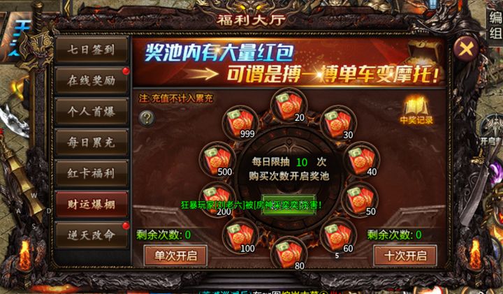 游戏里还有个超有意思的“财运爆棚”玩法,奖池里全是实打实的红包奖励,每日限抽10次,说白了就是搏一搏单车变摩托,运气好的话,一次就能抽中大额灵符或元宝奖励,零充党也能靠这波欧气逆袭。不过要提一嘴,这里的充值是不计入累充额度的,纯粹是拼手气的娱乐玩法,平时刷怪累了,闲暇之余抽几次,说不定就能收获意外惊喜,给发育之路添点助力。