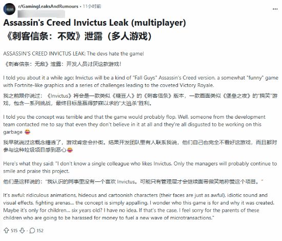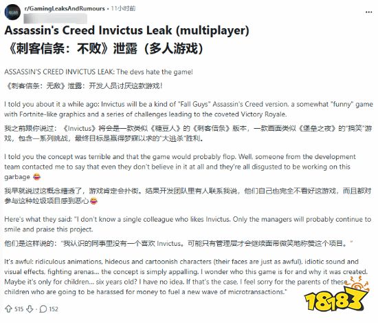 近日,有关育碧刺客信条系列新多人衍生作品刺客信条Invictus的传闻在网络上引发热议。据称,该作将是一款类似糖豆人终极淘汰赛的闯关类游戏,整体画风则接近堡垒之夜。然而,这一创意并未获得玩家社区的认可。