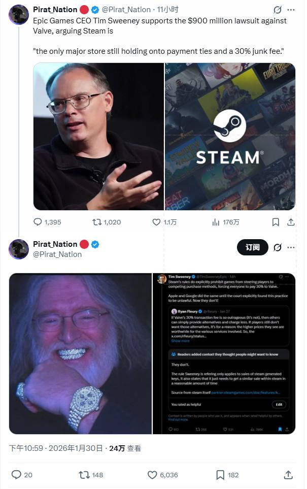 Steam能够长期维持高抽成与严格规则,很大程度上得益于其市场主导地位与先发优势。但如果英国这起集体诉讼,以及美国正在推进的类似案件最终对Valve不利,Steam可能将不得不对其商业政策作出实质性调整。届时,斯威尼显然不会错过继续公开评论的机会。