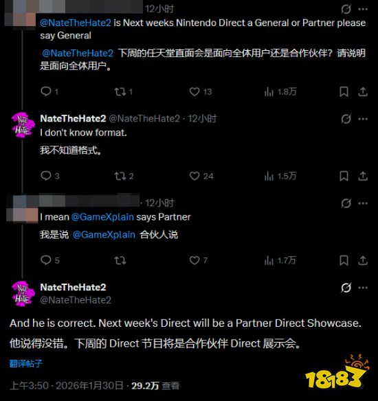 据多位知名消息人士与外媒报道,任天堂计划于2月5日举办一场专注于第三方合作伙伴的新一期直面会。消息人士Nate The Hate与媒体GameXplain均确认了该直面会的存在与大致时间,并表示这将是一场展示第三方游戏的合作伙伴发布会。