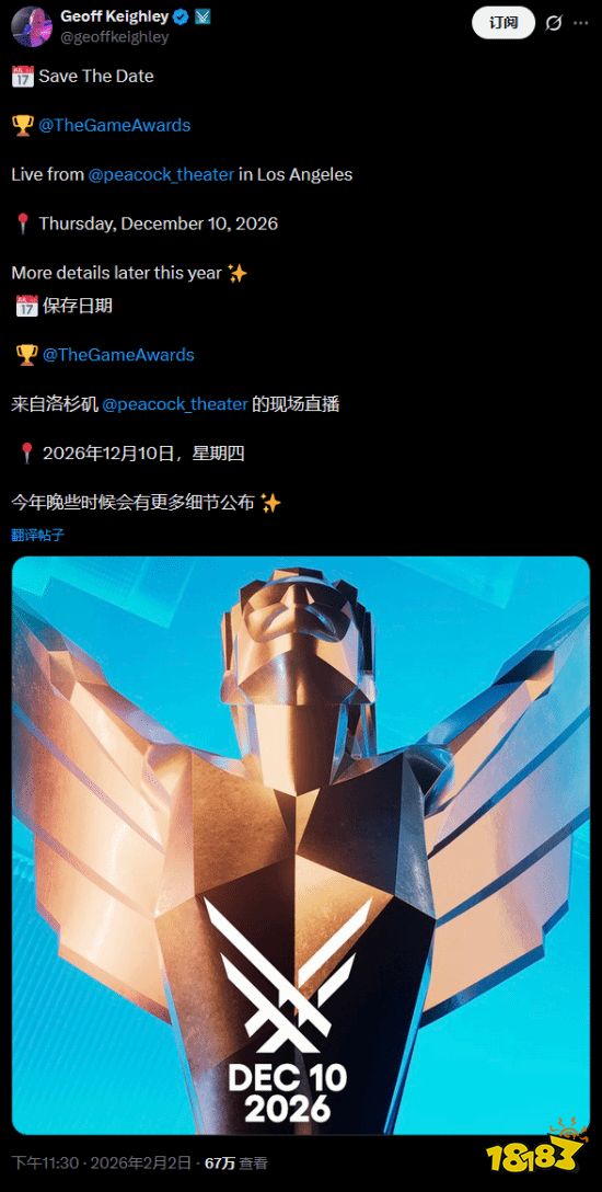 尽管2026年刚进入第二个月,TGA的核心日程已提前敲定。Geoff Keighley表示,更多关于提名名单、具体流程及出展内容的细节将在年内陆续公布。这为众多计划在2026年发售的大作留下了充足的参评窗口。