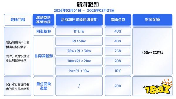 巨量引擎本轮激励政策的一个显著导向,是向“同发新游”提供了极具竞争力的扶持条件。对于选择将抖音作为首发或同步首发平台的小游戏产品,政策设定了更具吸引力的启动激励:活动期内抖音小游戏素材满足指定要求,只需日均消耗增量达到1万元,即可获得40%的激励点位,且在过程指标上要求更为简化。这为开发者在新品关键启动期,大幅降低了在抖音生态进行重点投放与测试验证的成本门槛。