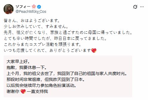 PeachMilky在声明中表示,上个月因其祖父去世,她返回祖国与家人共度了这段艰难时光。她为此前暂停活动向粉丝致歉,并确认已于昨日返回日本,未来将继续努力开展Cosplay等相关工作。