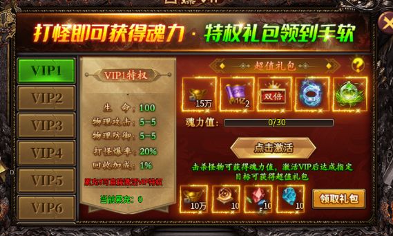 更绝的是VIP居然能白嫖!不用花一分钱,打怪攒魂力值就能激活全部VIP特权,物理攻击、防御、爆率、回收加成直接拉满,礼包领到手软。
