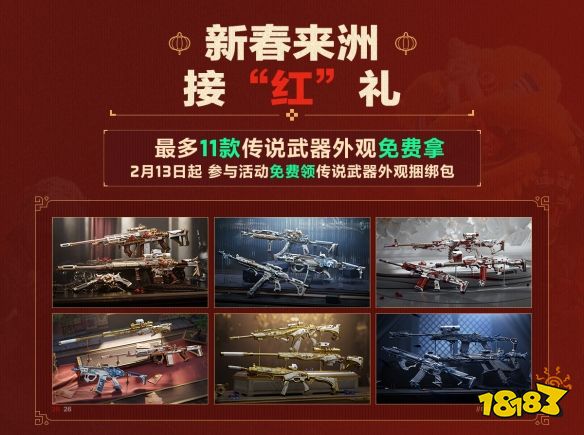 新春来洲接“红”礼!2月13日起,参与活动可领8款传说武器外观,2月16日起,参与活动可额外领取3款传说武器外观,最多可拿11款传说武器外观!