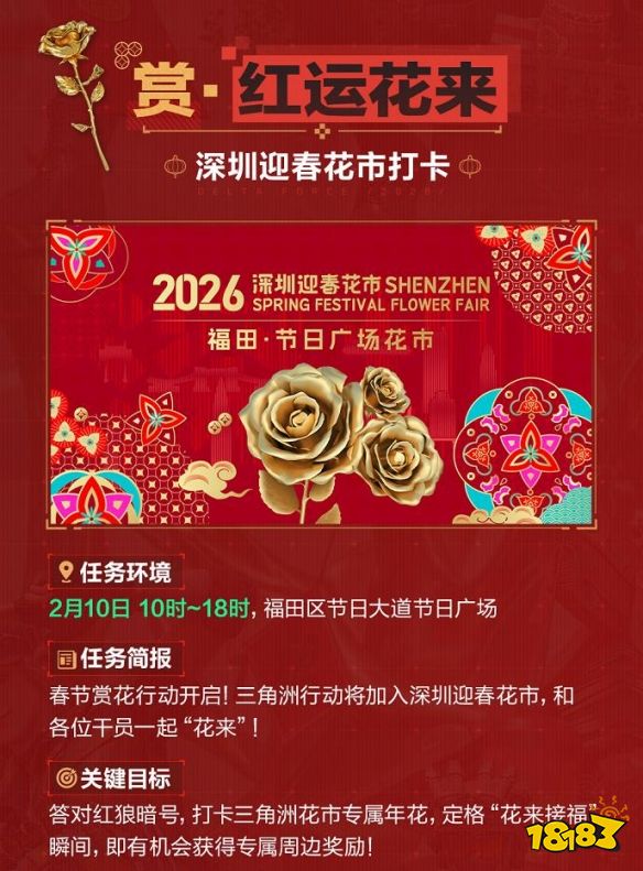 新春花市,红运花来。2月10日10:00-18:00,深圳迎春花市赏花行动开启,打卡三角洲花市专属年花,答对红狼暗号,定格“花来接福”瞬间,即有机会领取游戏专属周边奖励。