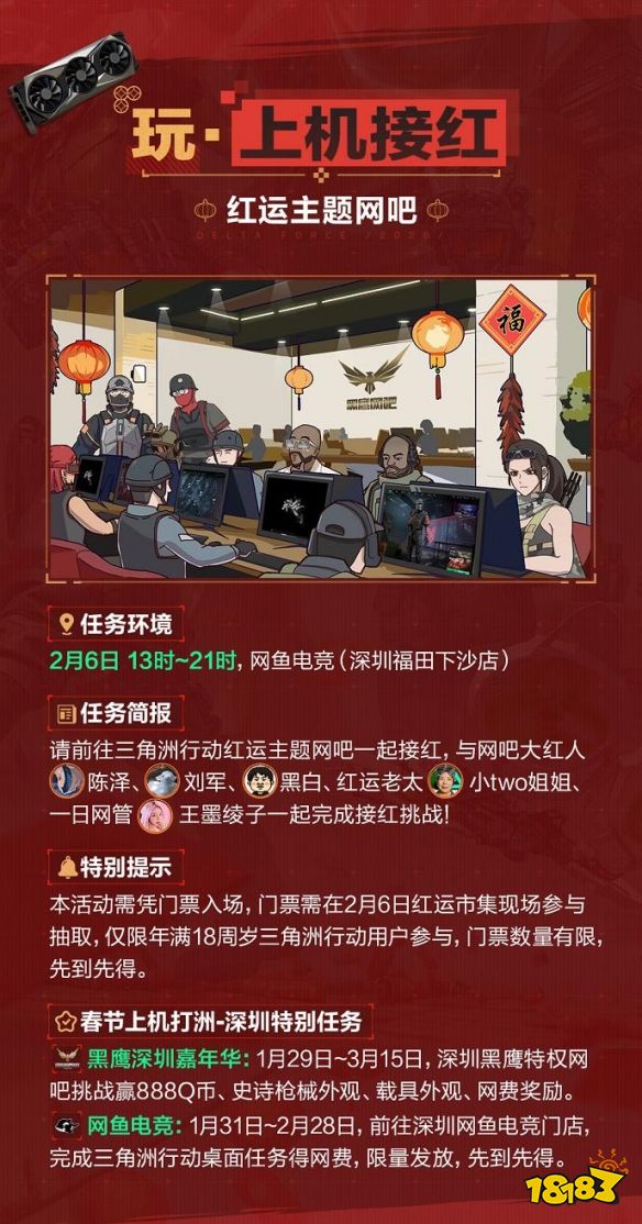 上机接红,红运主题网吧邀你开战。2月6日13:00-21:00,红运主题网吧网鱼电竞(深圳福田下沙店)特邀陈泽、刘军、黑白、红运老太、小two姐姐、一日网管、王墨绫子多位红人现场坐镇,等待干员一起完成接红挑战。