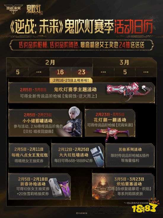 2月5日-3月8日,参与鬼吹灯赛季主题活动,即可免费获得全新传说品阶枪械【鬼铜蚀-逆火而上】。