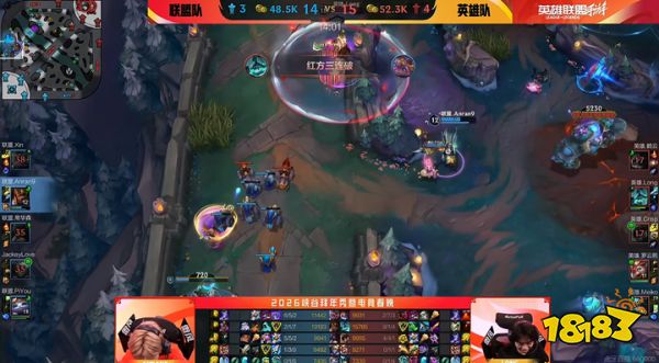 首局海克斯大乱斗,双方阵容各具特色。英雄队拿出了牛头、泽拉斯、青钢影、奎因与乌鸦;联盟队则以剑姬、杰斯、腕豪、佛耶戈与女枪迎战。