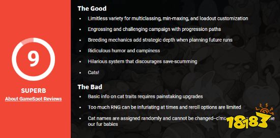 评测总结的优点包括:多职业搭配、极限属性培养与装备组合提供了近乎无限的多样性。引人入胜且富有挑战性的战役模式,附带多种成长路径。繁殖机制为规划后续挑战增添了战略深度。游戏充满荒谬搞怪、充满恶趣味的幽默感。其内置了一套阻止玩家反复读档刷结果的搞笑系统。当然,还有无处不在的猫元素。