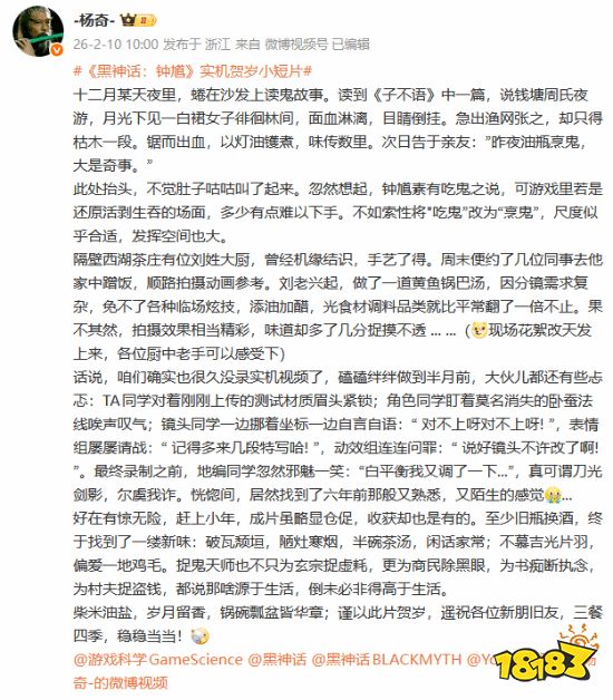 杨奇在发文中表示,若将传统神话中“钟馗吃鬼”的生吞活剥直接做进游戏,会有些难以下手,因此团队将其创意性地改编为“烹鬼”,这也为游戏内容的发挥提供了更大空间。他坦言,游戏科学已许久未录制此类视频,制作过程“磕磕绊绊”,直到半月前团队仍有些忐忑,这种感受给了他一种类似六年前黑神话悟空首次公布时的“又熟悉,又陌生”的感觉。