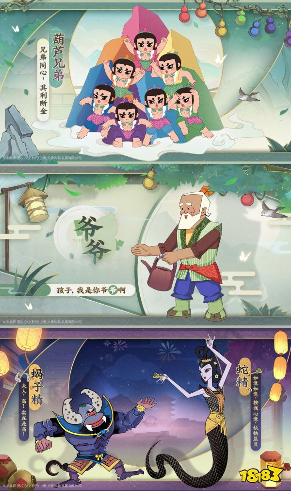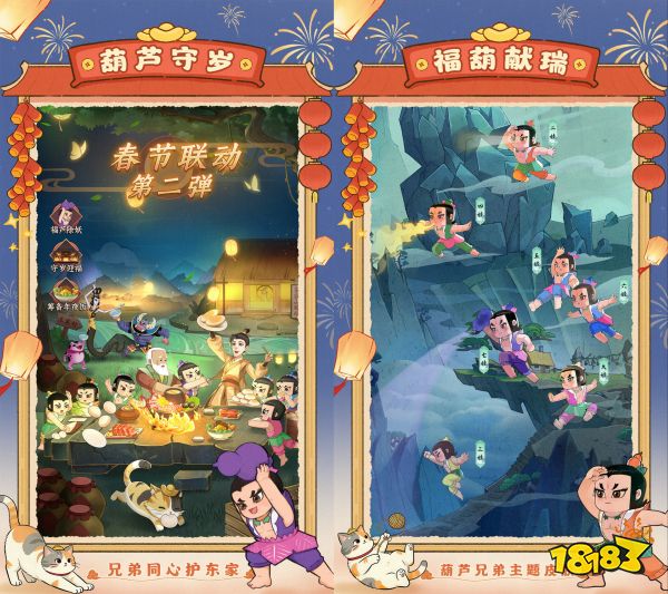 联动期间,葫芦兄弟、爷爷、蛇精与蝎子精等动画经典角色将齐聚东家村,每位角色的形象均力求贴近原作,唤起玩家的亲切记忆,使其更快融入联动主题的剧情与氛围之中。同时,游戏推出了全新联动玩法 “葫芦镇妖” ,不仅还原了动画中正邪对抗的经典框架,更将“兄弟同心,其利断金”的精神内核转化为需要精密协作的关卡策略,让玩家在重温经典情节的同时亲身实践团结与智慧的力量。