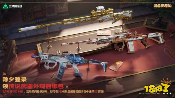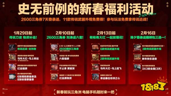 新春来洲接“红”礼!2月13日起,参与春节活动,可免费解锁8款传说武器外观。2月16日起登录游戏,更可额外领取3款传说武器外观,最多可拿11款传说武器外观!