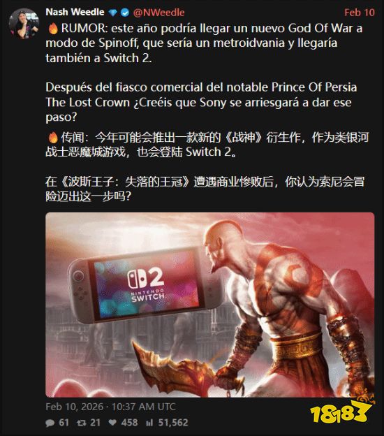 据多位游戏爆料人透露,索尼圣莫尼卡工作室正在开发一款《战神》系列的全新衍生作品。该作预计将采用2.5D视角与银河恶魔城式探索玩法,并有望登陆任天堂Switch 2平台,成为首款在PlayStation生态之外同步发行的《战神》游戏。
