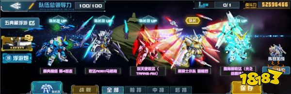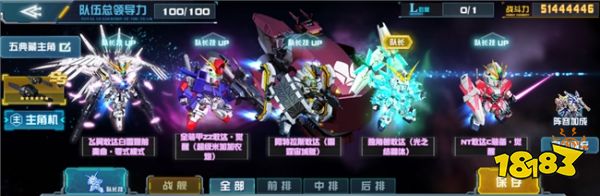 阵容一:5典主角。队长为独角兽敢达(光之结晶体),队员为飞翼敢达白雪姬前奏曲·零式模式、全装甲ZZ敢达·觉醒(超级米加加农炮)、阿特拉斯敢达(雷霆宙域版)、NT敢达C装备·觉醒。战舰推荐渔火
