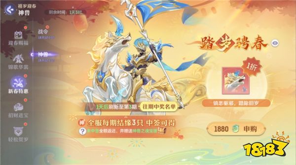 全服玩家均可参与<踏岁聘春>1折申购活动,中签即可直接领取新神兽踏岁,开局赢在起跑线上!若未中签则灵玉全额返还,并额外获赠神兽之魂宝匣,无论如何都有赚。
