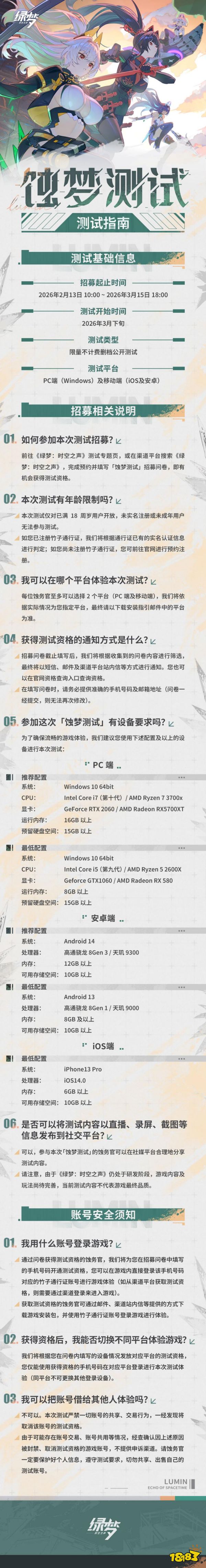 蚀务官,久等了,欢迎回到侵蚀管理局!今日(2026年2月13日),3D二次元横版ACT游戏《绿梦:时空之声》「蚀梦测试」招募正式启动,本次「蚀梦测试」为限量不计费删档测试,蚀务官可通过填写招募问卷、参与预约抽奖等多种途径获得测试资格。