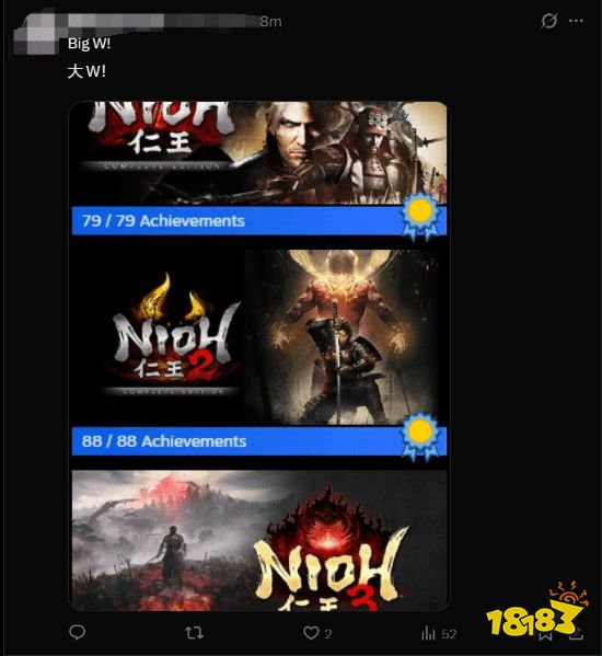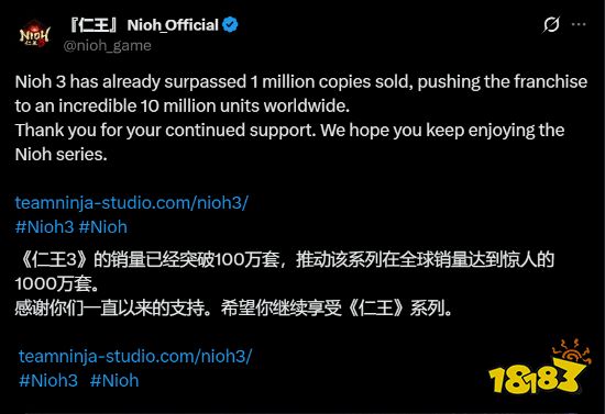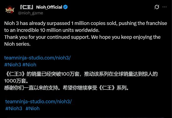 据《仁王》官方X账号最新消息,知名动作角色扮演游戏《仁王3》的全球销量已正式突破100万份。与此同时,随着新作的热销,《仁王》系列全球累计销量也达到了1000万份的里程碑。