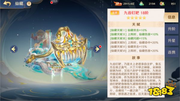 九齿钉耙:冷却减少至3回合,消耗仙藏怒气减少至30;对敌方前排造成一定倍率百分比的伤害并清除其所有属性增加类状态;前2次释放时,消耗怒气减少10并使后一阵位仙藏下一次释放技能目标数+1。