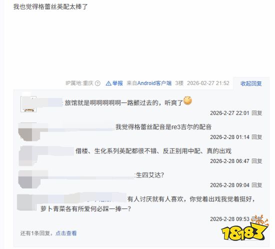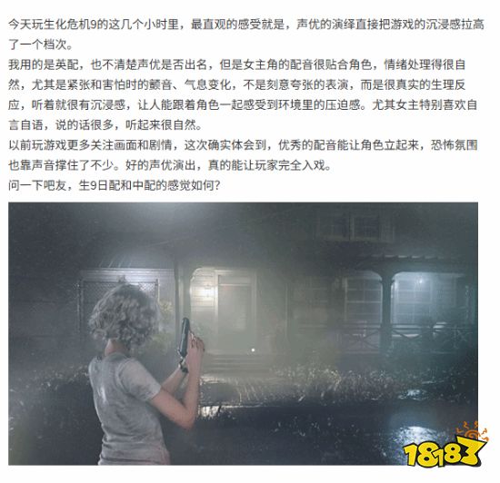 随着《生化危机9:安魂曲》正式发售,无数玩家涌入这个沉浸感拉满的游戏世界,而提升沉浸感的一大要素就是配音。贴吧玩家对此给予高度评价,认为声优的演绎直接将游戏的沉浸感拉高了一个档次。尤其是新主角格蕾丝,许多玩家表示她的英文配音让人听得非常过瘾。
