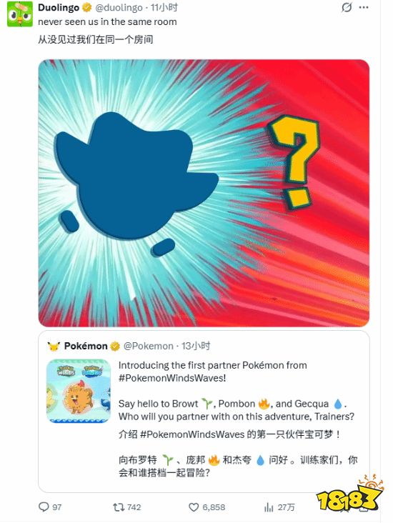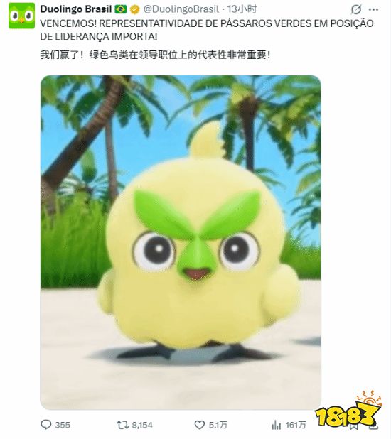 语言学习应用多邻国的官方账号近日在社交媒体上玩梗,将自家绿色猫头鹰吉祥物与《宝可梦:风/波》新公布的草系御三家叶眉鸟联系起来。多邻国巴西账号发文感叹:“赢!绿色鸟类在领导职位上的代表性非常重要!”