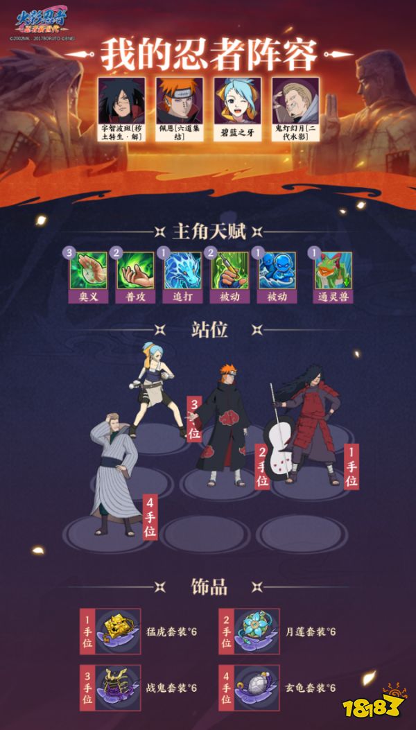 1、宇智波斑[秽土转生·解]+佩恩[六道集结]+鬼灯幻月[二代水影]+碧蓝之牙