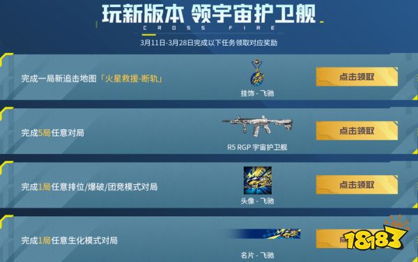 3月11日-28日,CFer完成游玩新追击地图、5场游戏对局与指定模式对局等任务即可领取头像-飞驰、名片-飞驰、挂饰-飞驰以及R5 RGP宇宙护卫舰。