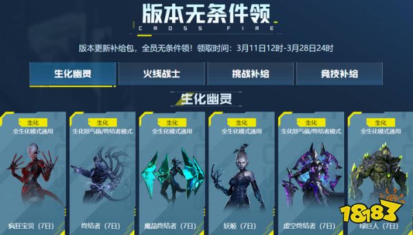 3月11日12时-28日24时,CFer还可领取版本更新补给包,生化幽灵、火线战士、挑战补给、排位补给四重礼包全员无条件领!
