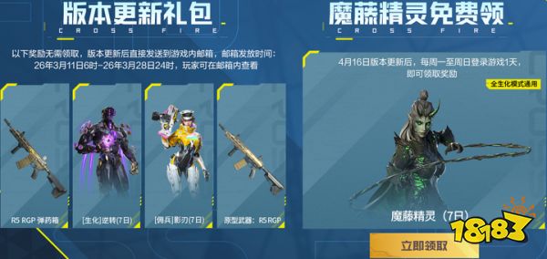 3月11日6时-28日24时,CFer还可在邮箱内领取逆转(7日)、影刃(7日)、R5 RGP 弹药箱以及原型武器R5 RGP,版本更新后登录游戏还可领取魔藤精灵(7日)。