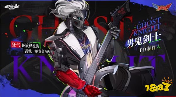 组合制作人男鬼剑最具有标志性的就是他那副半人半机械的躯体,配上皮夹克与工装裤,仿佛一位赛博音乐人。同时他也是组合的吉他手,武器也顺理成章变成了电吉他,一手狂野的吉他演奏,和冰冷的半机械造型形成了强烈的反差。