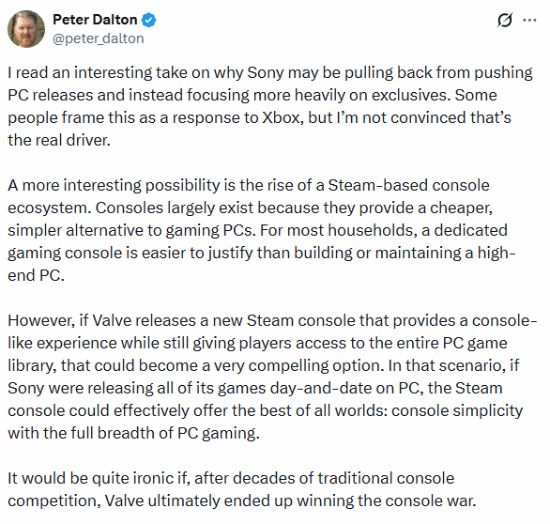 有人认为索尼反PC是应对Xbox——微软下一代主机本质是搭载Xbox界面的PC,但Dalton认为,Valve在硬件领域的崛起才是关键原因。他表示,基于Steam的主机生态正在崛起。主机的核心优势是比游戏PC更便宜简单,对多数家庭而言,买专用主机比组装维护高端PC更易接受。