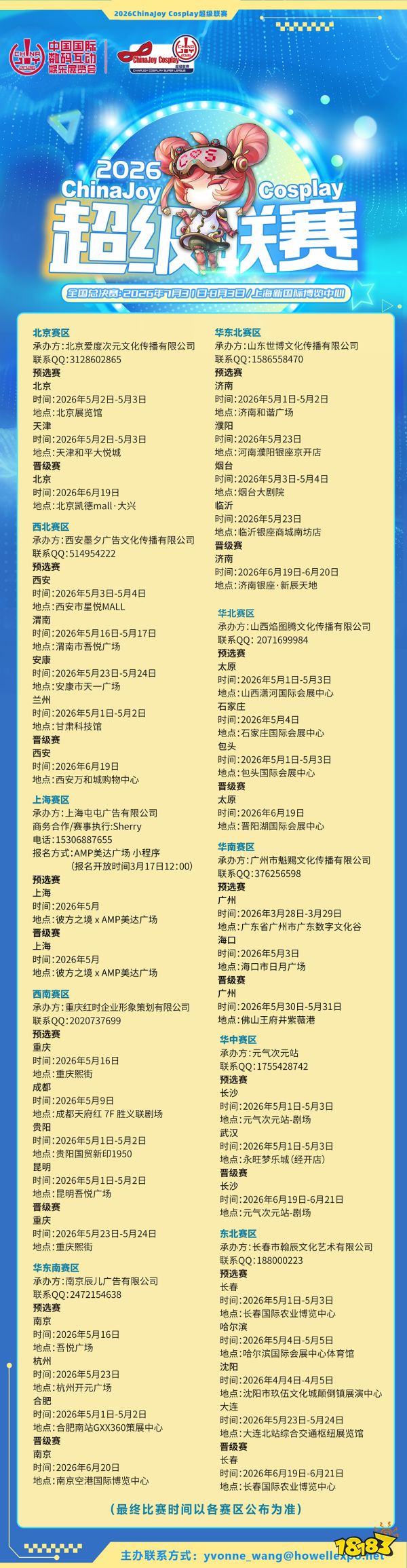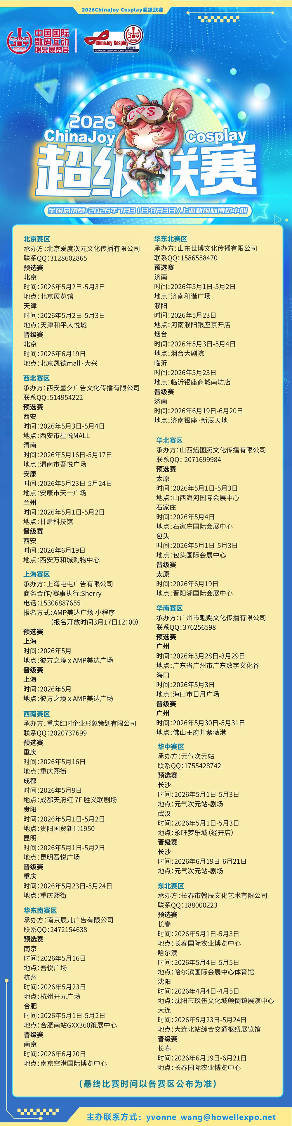 2026 ChinaJoy Cosplay超级联赛总决赛将于7月31日—8月3日在上海新国际博览中心举行,届时有超过百家媒体对赛事进行报道。