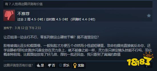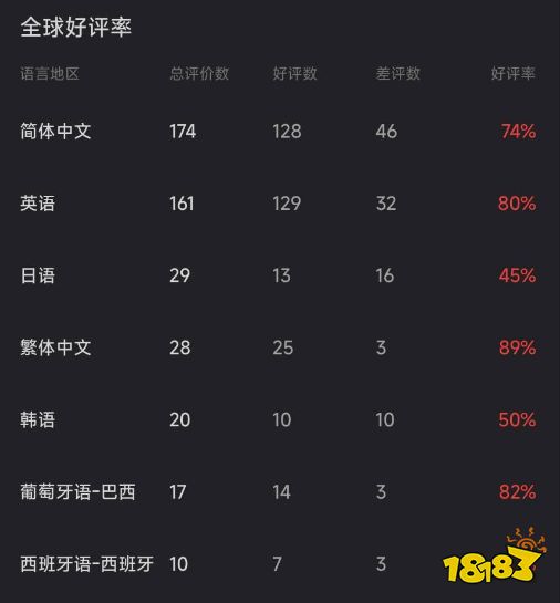 从地区评价来看,简中地区评论数最多,共计174条,好评率为74%;英语地区161条,好评率80%;日语和韩语地区评价数量不多,但好评率出奇低,仅有45%和50%。