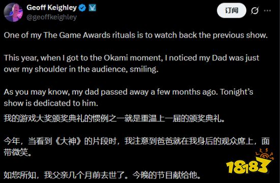 杰夫的父亲大卫·基利(1948–2025)于2025年去世,享年77岁,是一位加拿大电影业资深制作人和影像质量专家,被视为IMAX电影技术发展的重要推动者之一。他曾担任IMAX的首任首席质量官,监督了500多部IMAX影片的后期制作,并与多位顶级导演合作,将导演的视觉创意真实呈现在世界最大银幕上。在TGA2025举办之前不久,杰夫还特意发文,希望将该届TGA作为献给他父亲的礼物。