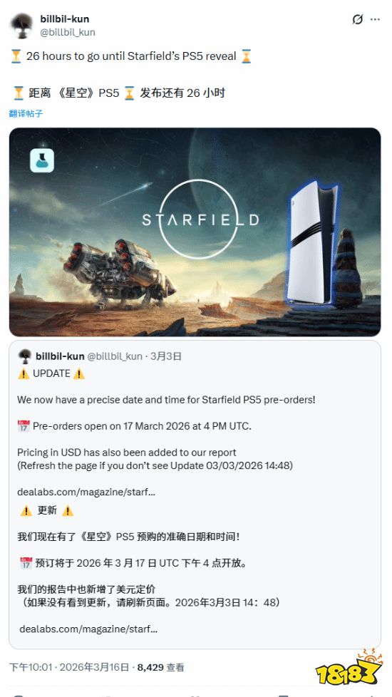 2026年3月16日,知名游戏爆料人billbil-kun发布倒计时推文,距离《星空》PS5版正式揭晓仅剩26小时,同时曝光预购时间与定价信息,彻底坐实这款微软曾标榜主机独占的太空RPG将登陆PS5平台。