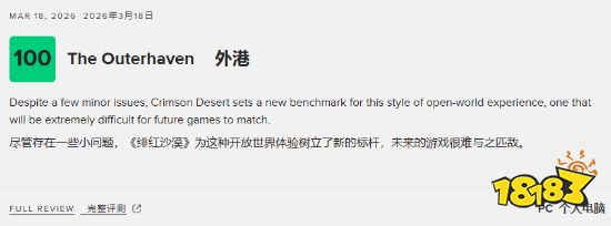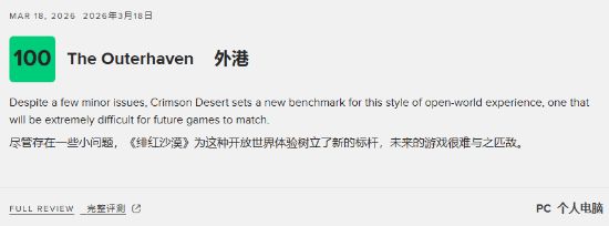 外媒The Outerhaven为新游《红色沙漠》打出满分,称其为开放世界树立了新的标杆,未来的游戏很难与之匹敌。