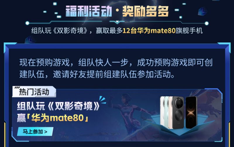 组队不仅能提前锁定玩伴,更有多重福利加持:队内任意成员分享邀请链接或邀请码,每成功邀请1名新成员加入,邀请者与新成员均可获得专属奖励,每支队伍最多可领取3次邀请奖励;游戏上线(4月3日)后,成队仅需1人拥有游戏,全队即可共同做任务累计积分,多名成员购买可叠加积分,积分可用于队伍排行、个人抽奖,赢取华为Mate80、罗技键鼠套装等豪礼。