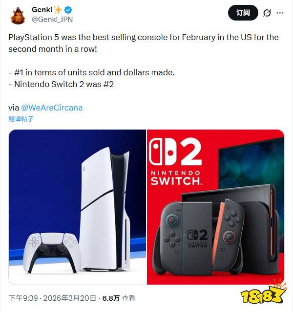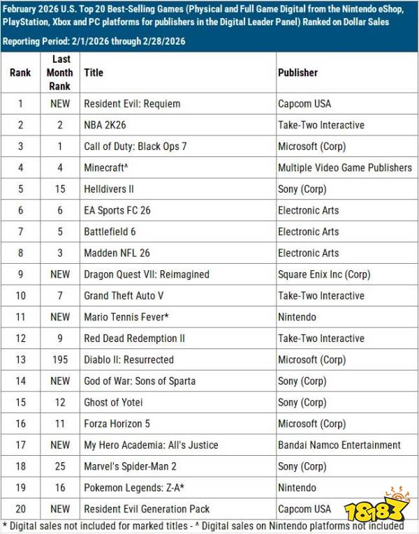 2月新游《勇者斗恶龙7:重制版》位列第七,《马里奥网球:狂热》位列第十一。硬件方面,PS5连续第二个月成为美国最畅销主机,销量与收入均第一,Switch 2位列第二。