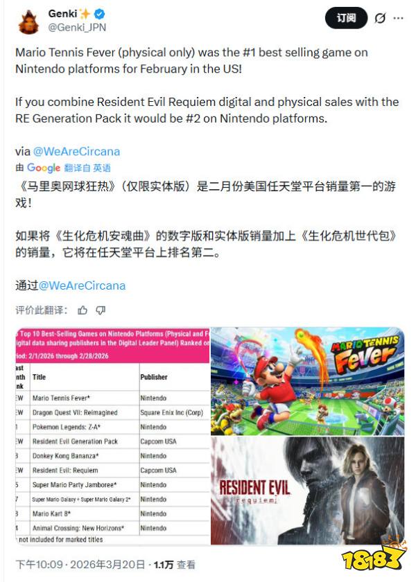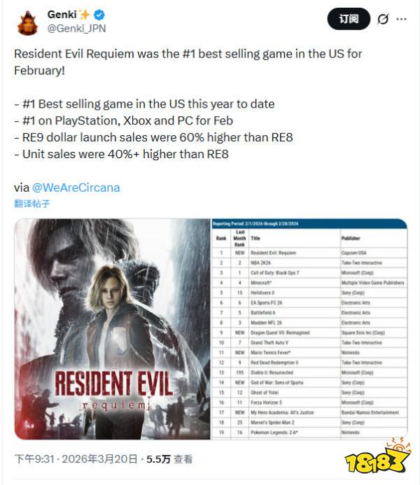 Circana公布2026年2月美国游戏销量榜,2月最后两天发售的《生化危机9:安魂曲》成功登顶,在PC、PS、Xbox三大平台均拿下单平台第一。该作首发销售额超《生化危机8》60%,销量多40%,成为2026年迄今美国销量最高的新游戏。